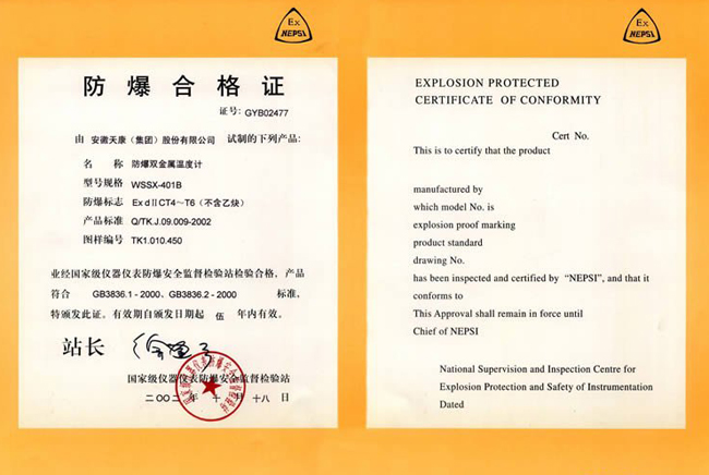 防爆雙金屬溫度計領(lǐng)取了由國家級儀器儀表防爆安全監(jiān)督檢驗站出具的防爆合格證2