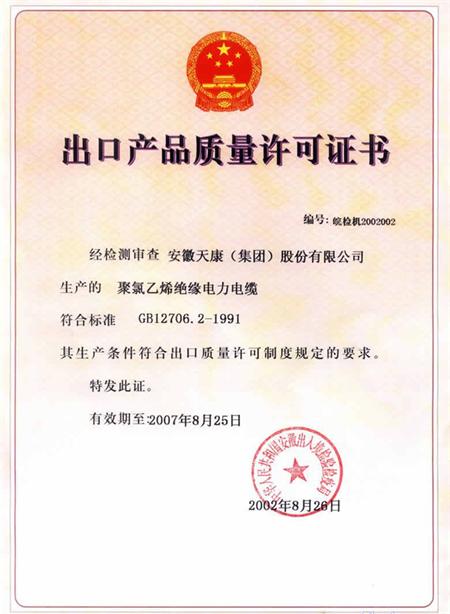 聚氯乙烯絕緣電力電纜獲中華人民共和國(guó)安徽出入境檢驗(yàn)檢疫局評(píng)定的產(chǎn)品質(zhì)量許可證書(shū)